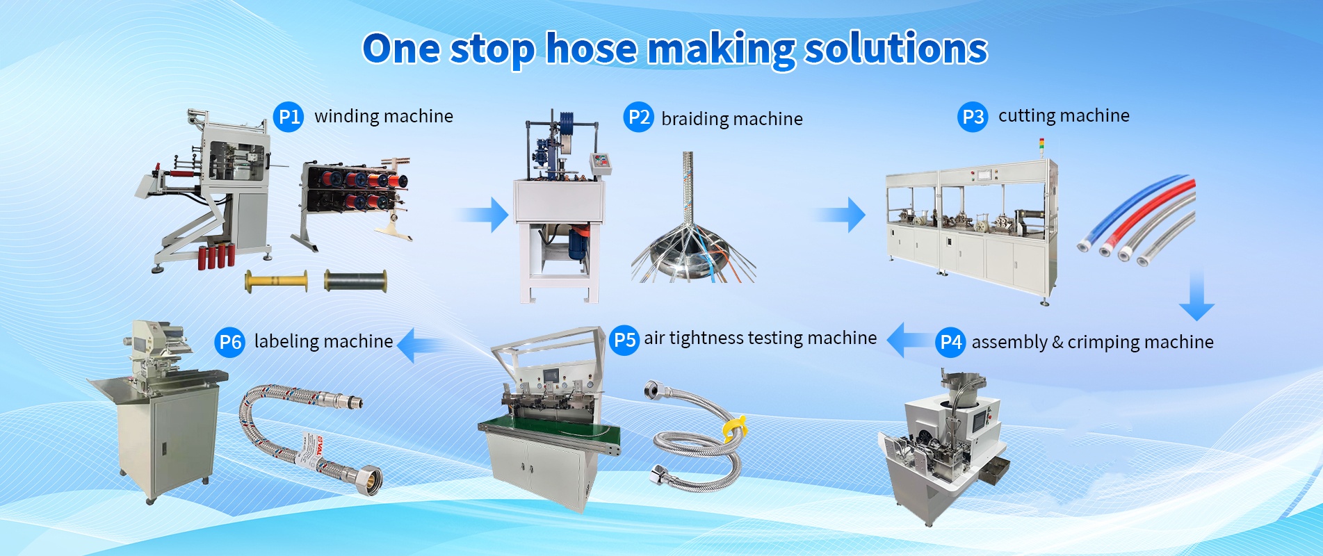 Kami terkenal dalam menyediakan solusi pembuatan selang yang lengkap, meliputi mesin penggulung kawat, mesin pengepang selang, mesin pemotong selang, mesin perakitan selang, dan mesin crimping selang, mesin perakitan cincin-O, termasuk mesin yang sepenuhnya otomatis dan mesin semi-otomatis sesuai permintaan pelanggan, yang semuanya memainkan peran penting dalam produksi berbagai selang dan tabung.